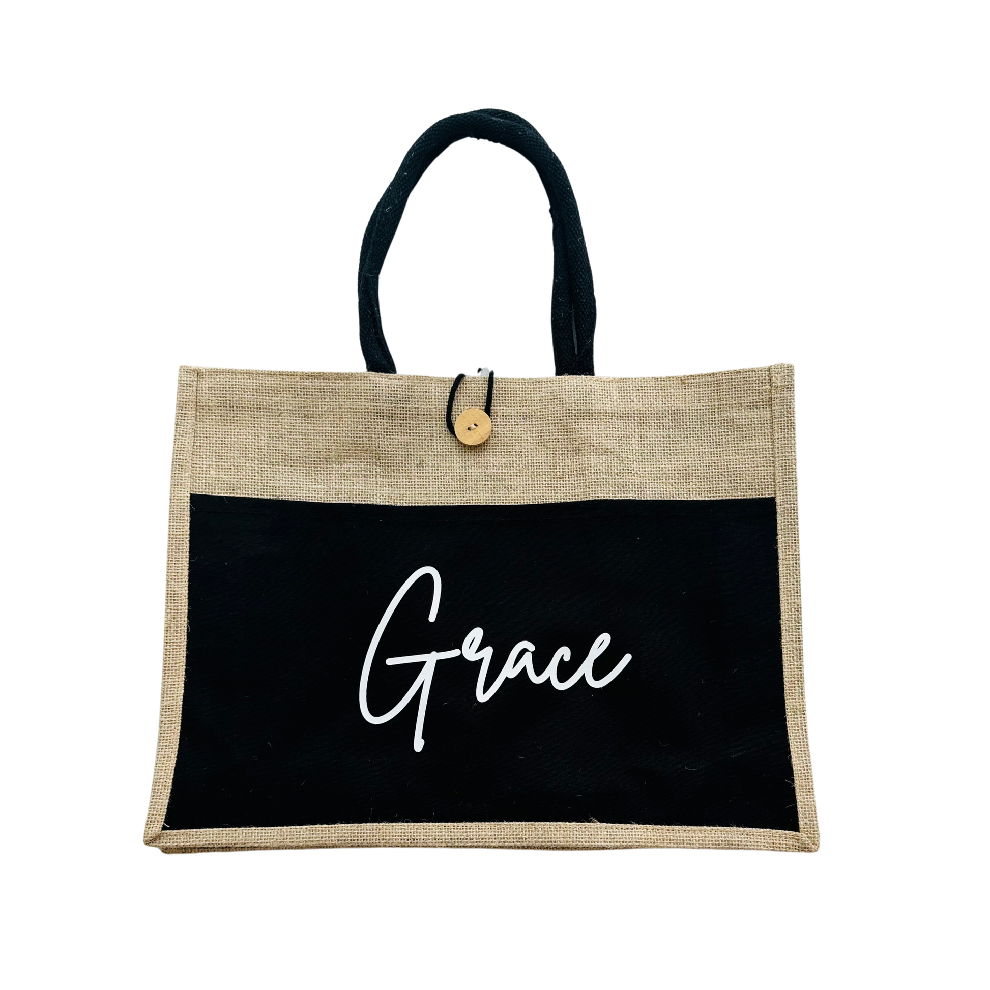 Stylish, eco-friendly, and uniquely yours — our burlap tote bag is the perfect carryall for everyday use or thoughtful gifting. Made from a blend of natural jute and cotton, this sturdy bag features a personalized name on the front, a convenient front pocket, and a button closure to keep your items secure.